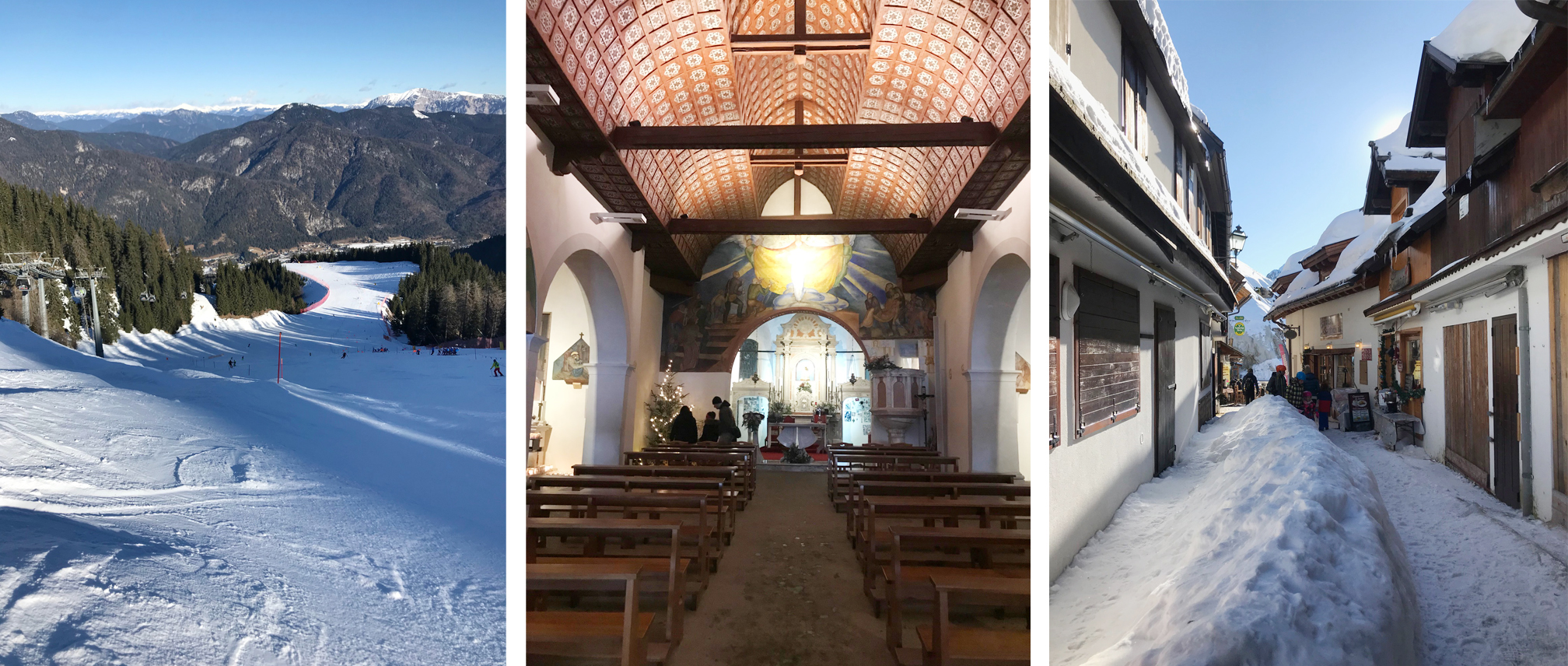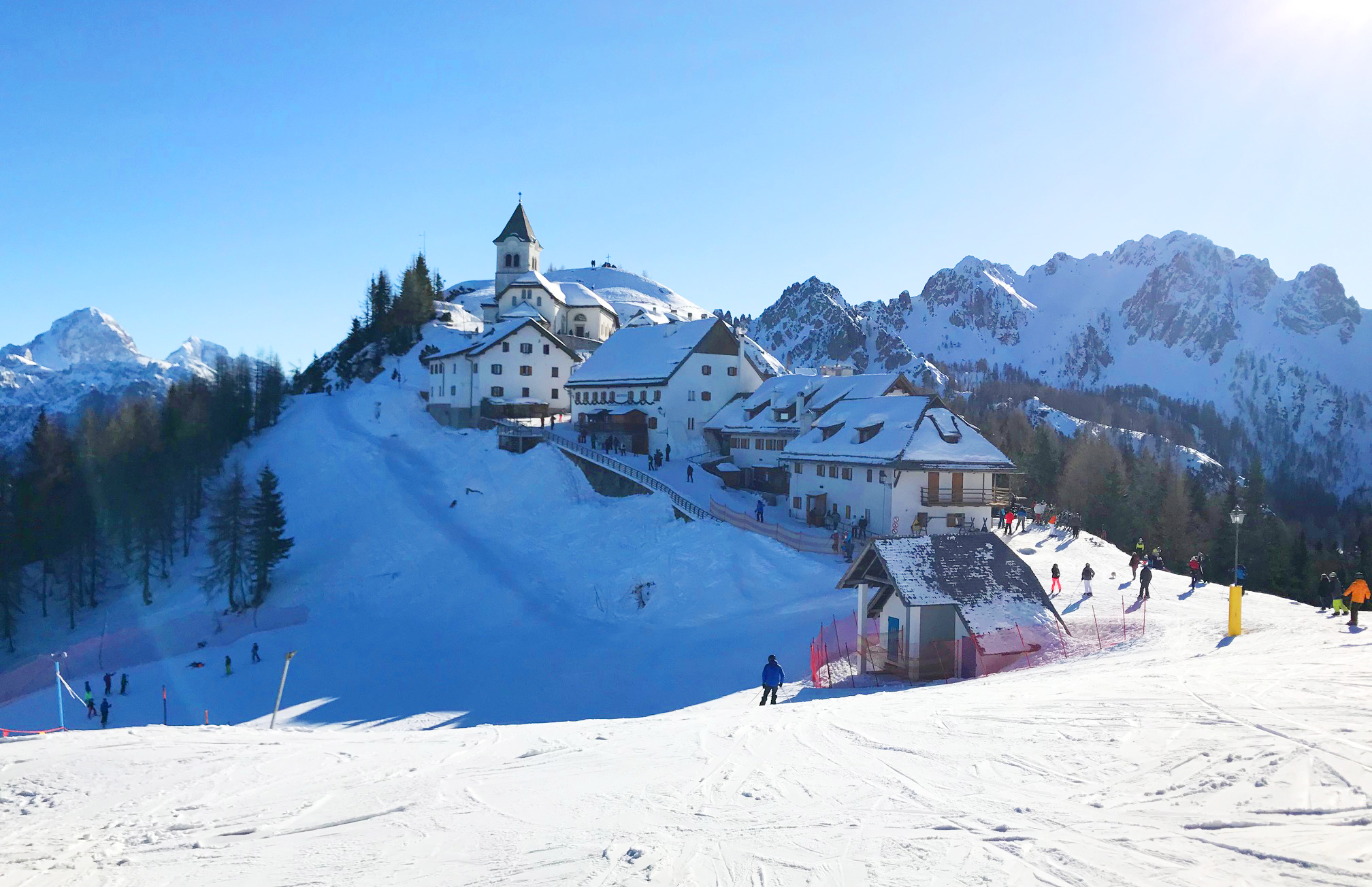 A do restaurace na limonádu a na kafe to byl kousek. Na každém prospektu na vás vykoukne obrázek mini městečka s kostelem z hory Monte Santo di Lussari. Je to kouzelné místo s řadou restaurací i ubytovacích možností. Dostat se sem můžete jen kabinovou lanovkou, a nebo pěkně po svých z údolí. Díky řadě pěších turistů má tohle místo zvláštní atmosféru, kde se při odpočinku míchají turisté a lyžaři. A kostel zve na mše.