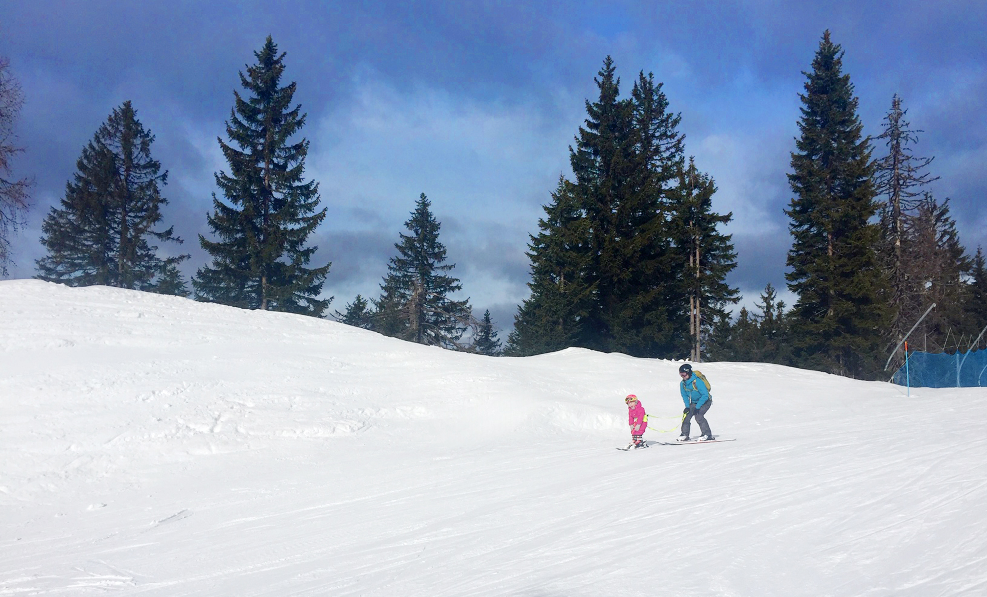 Je to malé středisko ve výšce cca 800 - 1800 m n.m. s 24 km sjezdovek. Z nich je jich víc než polovina červených nebo černých. To znamená, že se na svazích svezou i zkušení lyžaři nebo snowboardisti. Ale jsou zde i jednoduché pisty. Samozřejmě dole pod kopcem, ale nás s malou Elou bavila modrá sjezdovka na hřebenu, kde byl i pás a kde přes den skoro nikdo nejezdil a svítilo tam sluníčko.